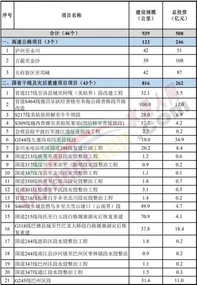 這是新冠肺炎疫情后,四川省首次舉行省級層面重大項(xiàng)目集中開工。涉及公路交通項(xiàng)目共46個(gè),總長939公里,總投資508億元。其中,高速公路項(xiàng)目3個(gè)、123公里、246億元,國省干線公路項(xiàng)目43個(gè)、816公里、262億元。