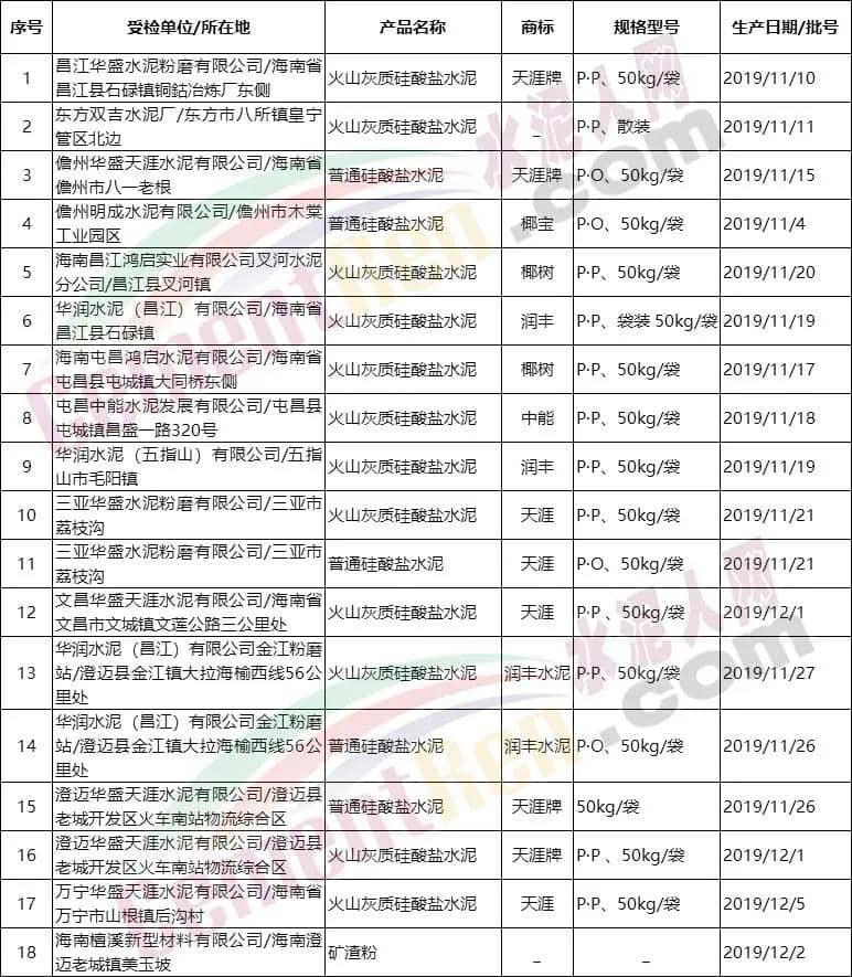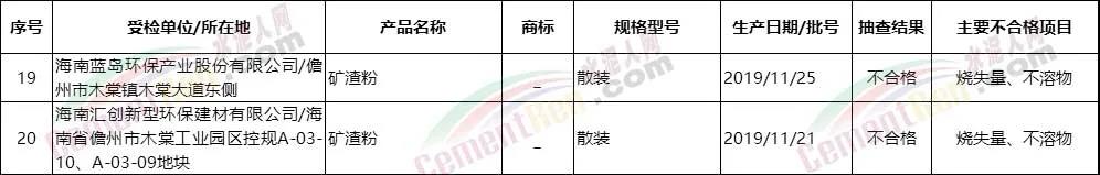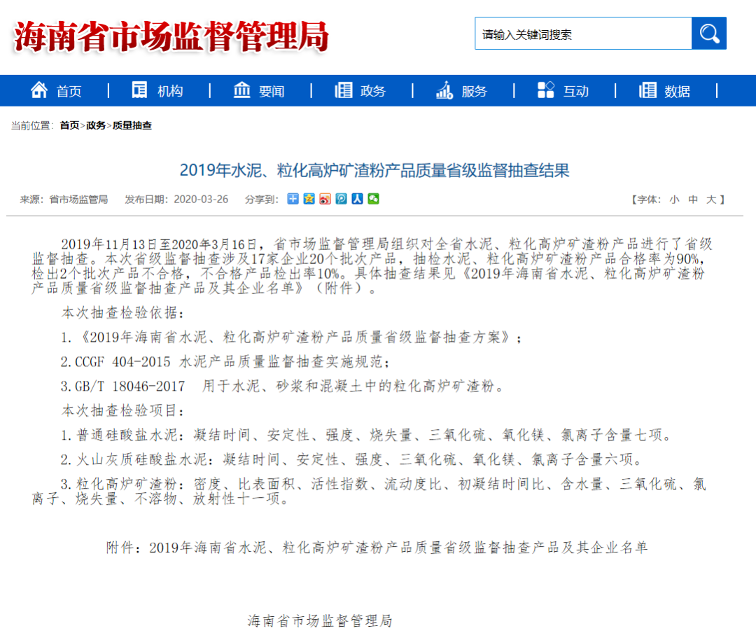 2020年3月26日,海南省市場監(jiān)督管理局網(wǎng)站公布2019年水泥、粒化高爐礦渣粉產(chǎn)品質(zhì)量省級監(jiān)督抽查結(jié)果。本次省級監(jiān)督抽查涉及17家企業(yè)20個批次產(chǎn)品,抽檢水泥、粒化高爐礦渣粉產(chǎn)品合格率為90%,檢出2個批次產(chǎn)品不合格,不合格產(chǎn)品檢出率10%。