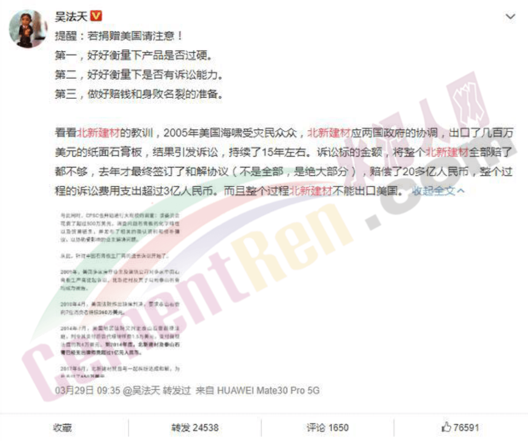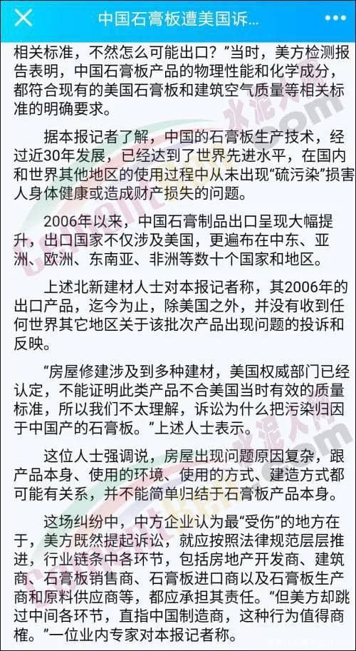 博主表示"2005年美國海嘯后,北新建材應(yīng)中美兩國政府的協(xié)調(diào),對(duì)美出口了幾百萬美元的紙面石膏板,結(jié)果引發(fā)訴訟,持續(xù)了15年之久。