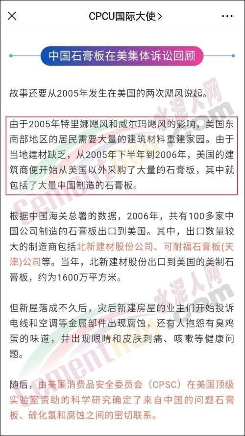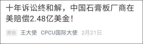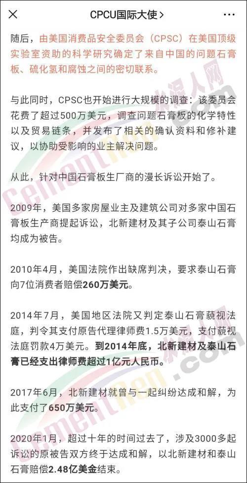 同時(shí),博主還附上了一張來自于公眾號(hào)"CPCU國際大使"的一篇文章截圖。從這一段文章截圖可以看出,北新建材以及它子公司泰山石膏在這場(chǎng)國際訴訟中付出了極大的時(shí)間以及財(cái)力成本,雖然最終達(dá)成和解,但仍要承擔(dān)巨額賠款。
