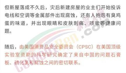 一是美國消費(fèi)品安全委員會(huì)的調(diào)查報(bào)告也一度認(rèn)定,中國的石膏板與原告所宣稱的含硫氣體和甲醛無關(guān)。
