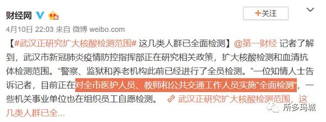 據@財經網 報道,武漢市新冠肺炎疫情防控指揮部正在研究相關政策,擴大核酸檢測和血清抗體檢測范圍。“警察、監獄和養老機構此前已經進行了全員檢測。”一位知情人士告訴記者,目前正在對全市醫護人員、教師和公共交通工作人員實施“全面檢測”,一些機關事業單位也在組織員工自愿檢測。