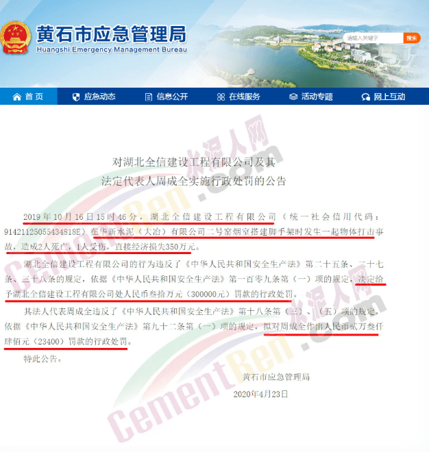 事故相關企業華新水泥(大冶)有限公司、湖北全信建設工程有限公司的行為違反了《中華人民共和國安全生產法》相關條款規定對上述公司及主要負責人總經理、法人做出相應的處罰。