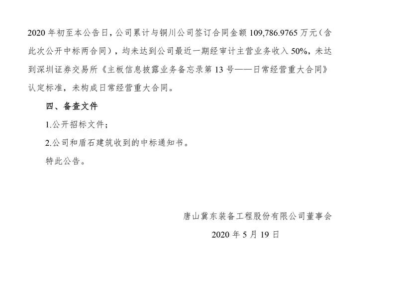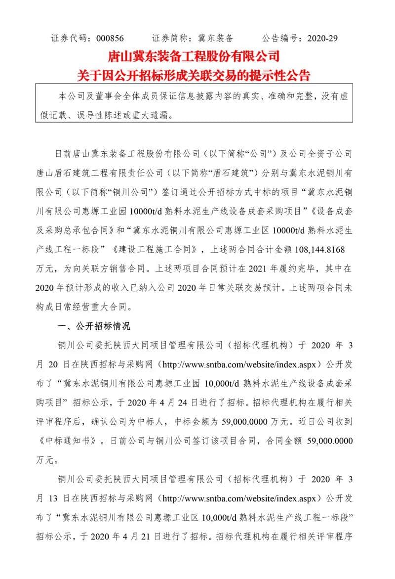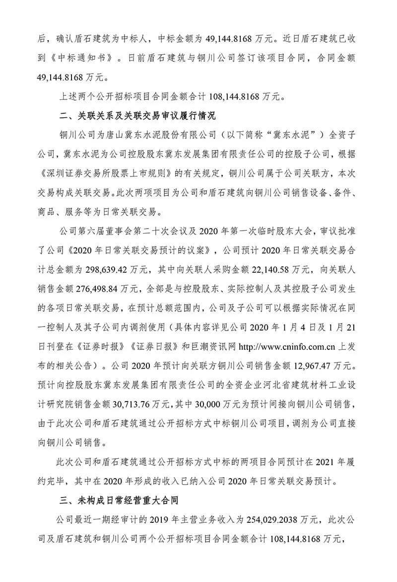 冀東裝備公布,日前公司及公司全資子公司唐山盾石建筑工程有限責任公司(“盾石建筑”)分別與冀東水泥銅川有限公司簽訂通過公開招標方式中標的項目“冀東水泥銅川有限公司惠塬工業園10000t/d熟料水泥生產線設備成套采購項目”《設備成套及采購總承包合同》和“冀東水泥銅川有限公司惠塬工業區10000t/d熟料水泥生產線工程一標段”《建設工程施工合同》,上述兩合同合計金額10.81億元,為向關聯方銷售合同。上述兩項目合同預計在2021年履約完畢,其中在2020年預計形成的收入已納入公司2020年日常關聯交易預計。 資料圖:冀東水泥 (來源:上市企業公告)