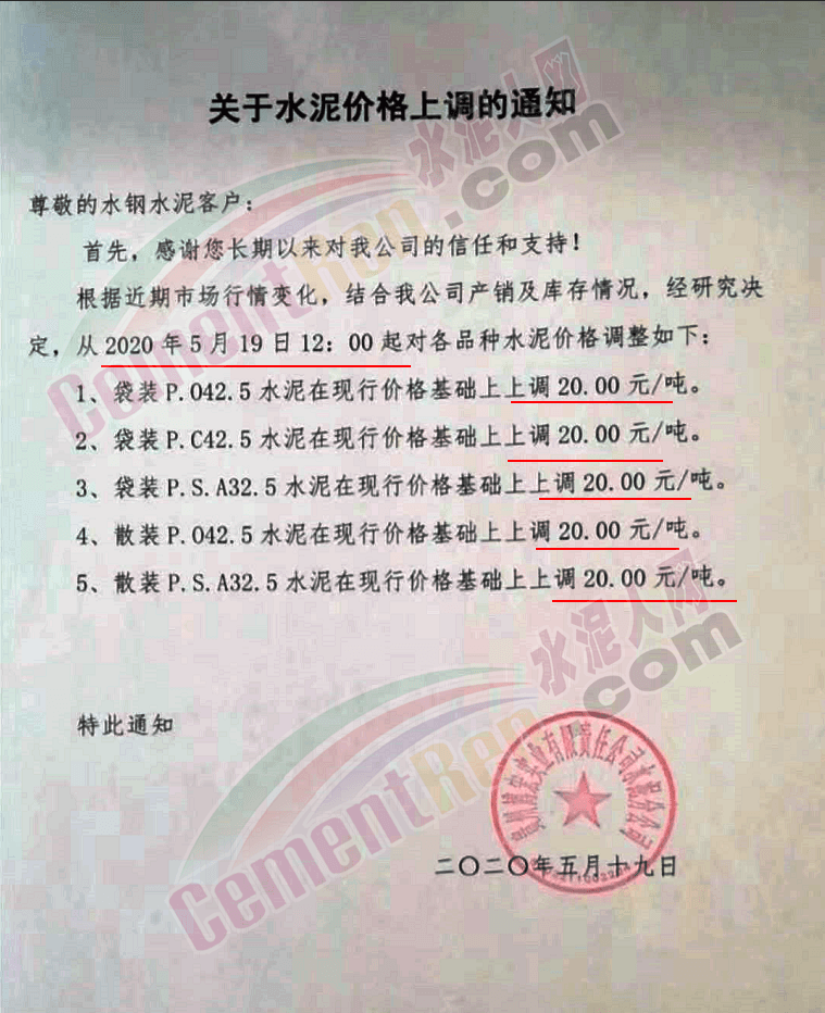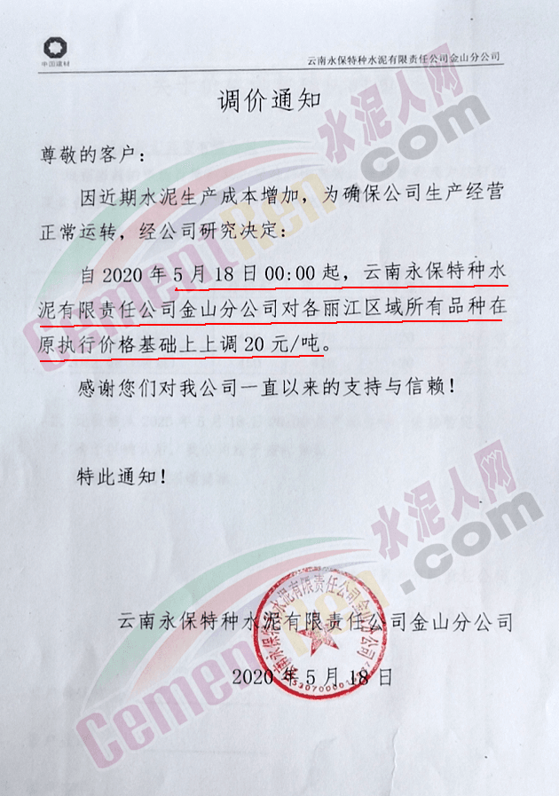 云南永保特種水泥有限責任公司金山分公司通知因近期水泥生產成本增加,為確保公司生產經營正常運轉,經公司研究決定 ,自5月18日0時起,云南永保特種水泥有限責任公司金山分公司對各麗江區域所有品種在原執行價格基礎上上調20元/噸。