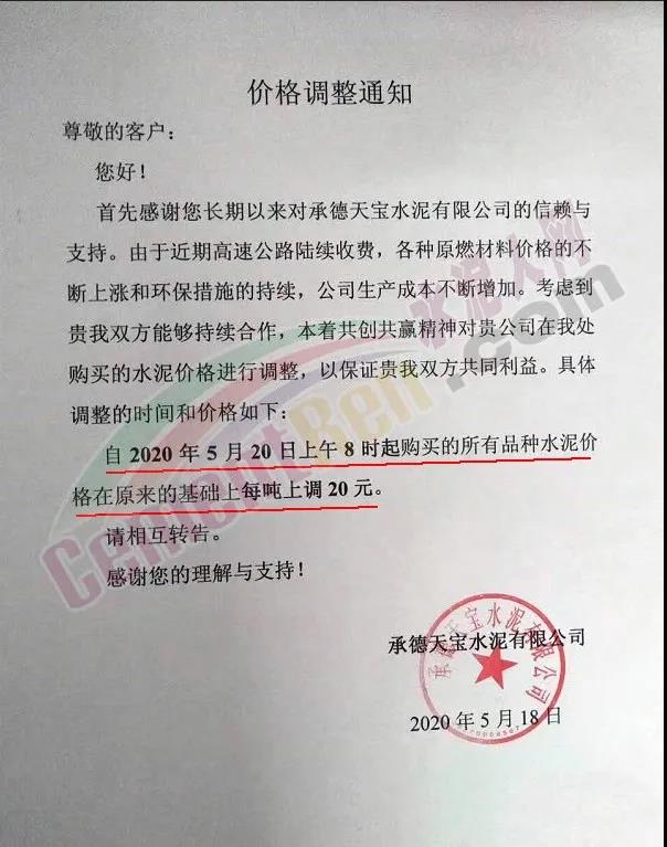 承德天寶水泥有限公司通知,由于近期高速公路陸續收費,各種原燃材料價格不斷上漲和環保措施的持續,公司生產成本不斷增加。自5月20日上午8時起所有品種水泥價格在原來的基礎上上調20元/噸。