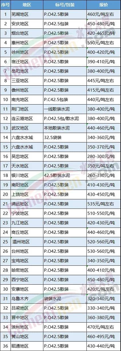 19日上饒地區水泥價格部分開始推漲20元/噸,市場主流P.O42.5散裝價格在430-450元/噸。