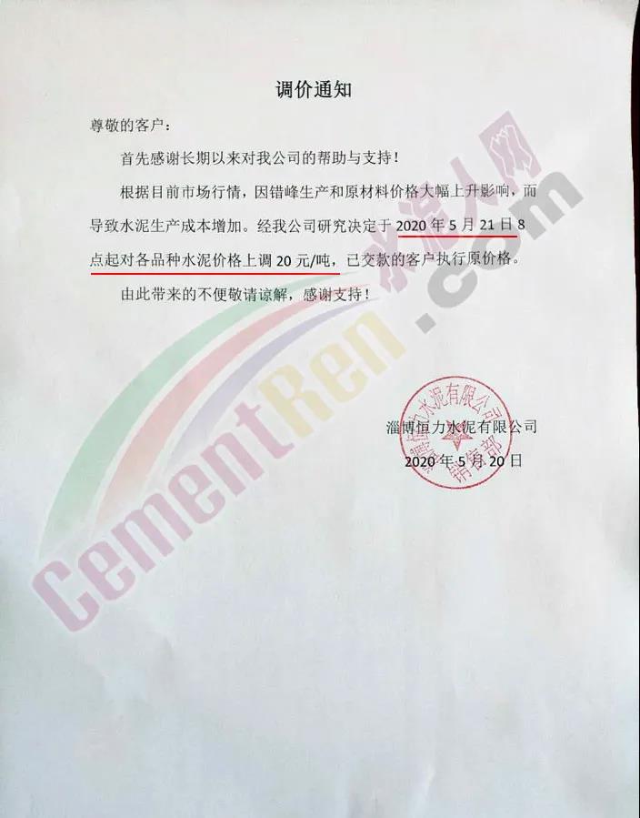 水泥人網通訊員消息:昨日(20日)淄博恒力水泥有限公司通知,根據目前市場行情,因錯峰生產和原材料價格大幅上升影響,導致水泥生產成本增加。經公司研究決定于今日(5月21日)8時起對各品種水泥價格上調20元/噸。