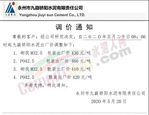 據水泥人網了解,近兩日,湖南區域多家企業也有通知上調水泥價格,20日湖南永州市九嶷驕陽水泥有限責任公司通知自5月20日8時起調整出廠價格。調整后各標號水泥出廠價如下: