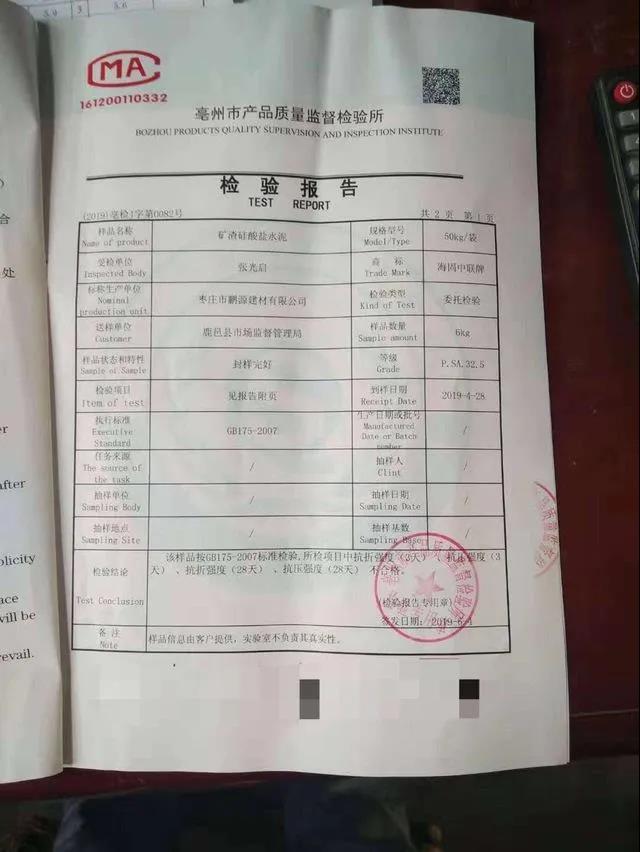 去年被媒體曝光的問題水泥 山東省棗莊市鵬源建材有限公司生產的“海固中聯牌”水泥 。