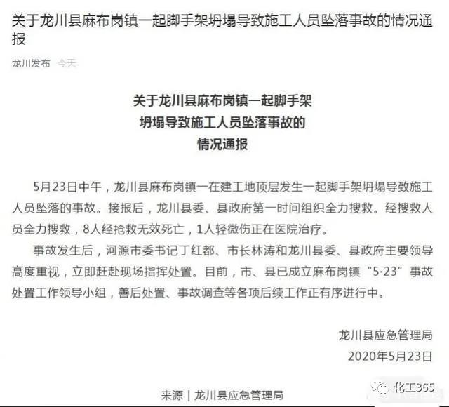 5月23日中午,龍川縣麻布崗鎮一在建工地頂層發生一起腳手架坍塌導致施工人員墜落的事故。接報后,龍川縣委、縣政府第一時間組織全力搜救。經搜救人員全力搜救,8人經搶救無效死亡,1人輕微傷正在醫院治療。事故發生后,河源市委書記丁紅都、市長林濤和龍川縣委、縣政府主要領導高度重視,立即趕赴現場指揮處置。目前,市、縣已成立麻布崗鎮“5·23”事故處置工作領導小組,善后處置、事故調查等各項后續工作正有序進行中。