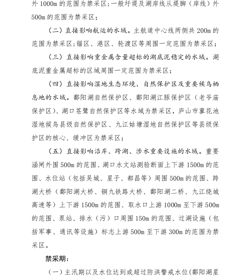 鄱陽湖九江水域禁采期1、主汛期(4-6月)以及水位達到或超過防洪警戒水位(鄱陽湖星子站達到警戒水位19.00m以上)的時候為禁采期;2、冬季鳥類棲息、珍稀水生動物和重要魚類資源保護要求的時段以及對環境有較大影響的時段(3月1日至6月30日)為禁采期;3、水利工程出現重大險情或者發生突發情況時(屬突發性禁采期);4、橋梁、碼頭、水利以及過河隧道、纜線、管道等基礎設施施工期間;5、枯水期出現船舶滯留航道發生堵航期間和海事部門發布航行警告嚴禁船舶作業、航行期間;6、鄱陽湖規劃可采區以外的水域全年為禁采期;7、依法應當禁止采砂的其他時段。
