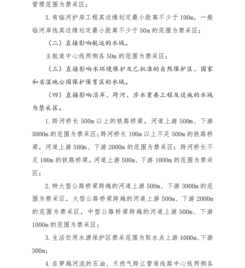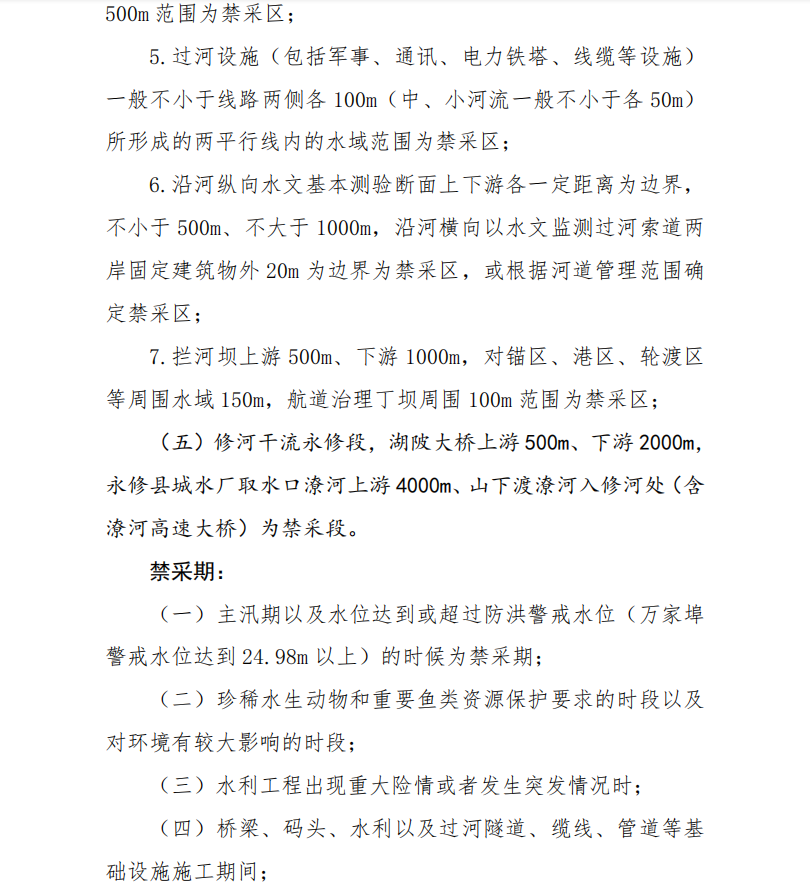 1、主汛期以及水位達到或超過防洪警戒水位(萬家埠警戒水位達到24.98m以上)的時候為禁采期;