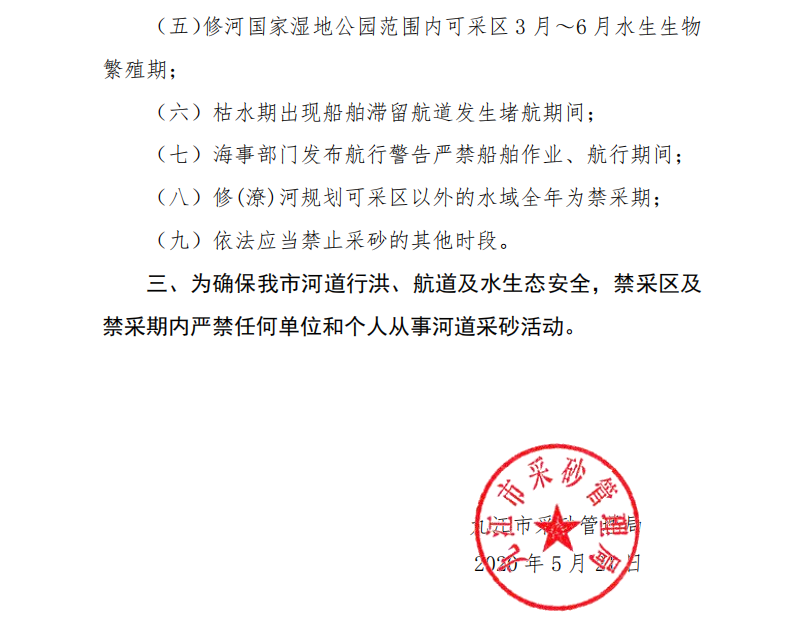 5月21日,九江市采砂管理局公布了該市河道采砂禁采區和禁采期。其中,鄱陽湖規劃采砂的九江水域3月1日至6月30日為禁采期。