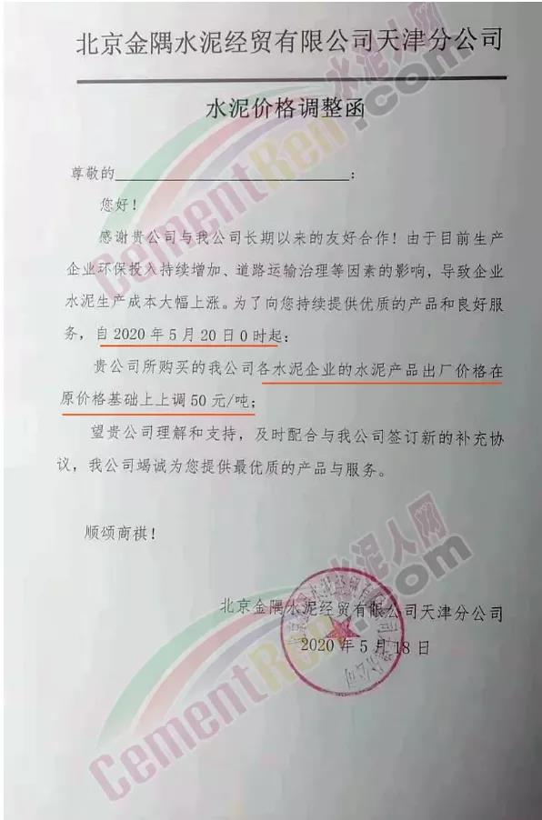 北京金隅水泥經(jīng)貿(mào)有限公司天津分公司通知,由于目前生產(chǎn)企業(yè)環(huán)保投入持續(xù)增加、道路運輸治理等因素的影響,導致企業(yè)水泥生產(chǎn)成本大幅上漲。自5月20日零時起水泥出廠價在原價格基礎(chǔ)上上調(diào)50元/噸。