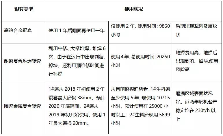 我們工廠在生料磨輥套和磨盤襯板使用上,曾用過高鉻鑄鐵輥套和磨盤襯板、耐磨堆焊復(fù)合輥套和磨盤襯板,在2018年4月對(duì)1#生料磨將原耐磨堆焊復(fù)合輥套和磨盤襯板更換為重慶羅曼新材料科技有限公司制造的“蜂窩王”陶瓷金屬復(fù)合輥套和磨盤襯板,又在2019年3月對(duì)2#生料磨同樣更換為該公司制造的陶瓷金屬復(fù)合輥套和磨盤襯板。我們對(duì)近幾年輥套的使用做了以下對(duì)比: