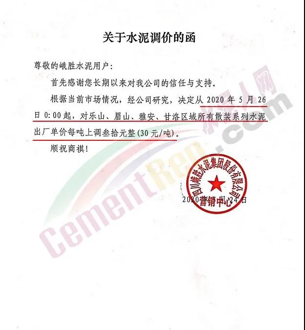 四川峨勝水泥通知自5月26日0時起,對樂山、眉山、雅安、甘洛區域所有散裝系列水泥出廠單價每噸上調30元/噸。
