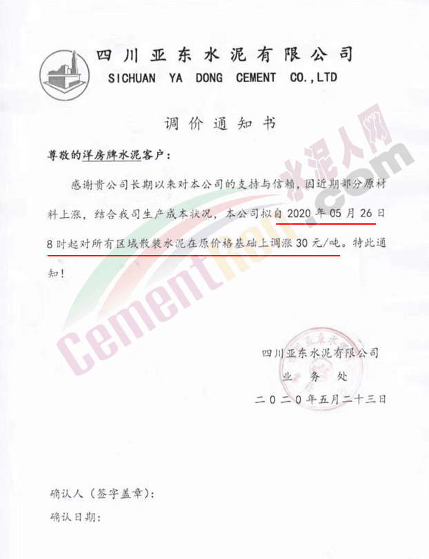 四川亞東水泥有限公司通知自5月26日8時起對所有區域散裝水泥在原價基礎上上調30元/噸。