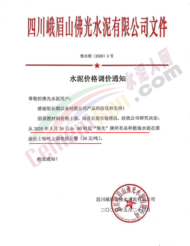 四川峨眉山佛光水泥有限公司通知稱,因原燃材料價格上漲,結合目前市場情況,經公司研究決定 從5月26日0時起“佛光”牌所有品種散裝水泥在原基價上每噸上調30元。