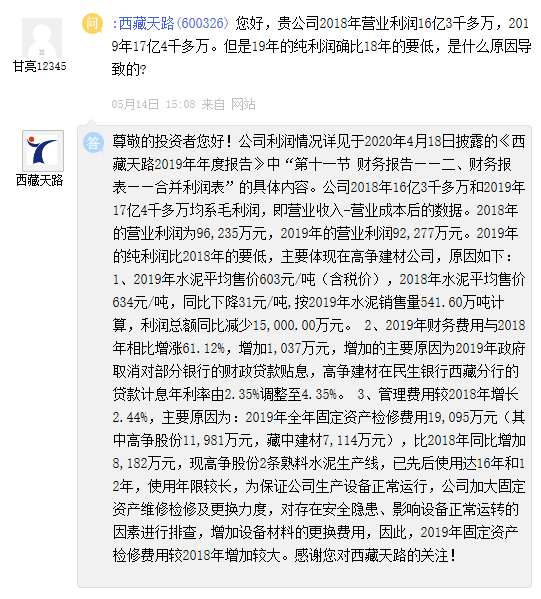 公司回答表示,公司利潤情況詳見于2020年4月18日披露的《西藏天路2019年年度報告》中“第十一節 財務報告――二、財務報表――合并利潤表”的具體內容。公司2018年16億3千多萬和2019年17億4千多萬均系毛利潤,即營業收入-營業成本后的數據。2018年的營業利潤為96,235萬元,2019年的營業利潤92,277萬元。2019年的純利潤比2018年的要低,主要體現在高爭建材公司,原因如下: