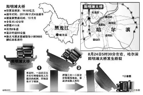 哈爾濱市政府公布了2012年“8.24”三環路群力高架橋洪湖路上行匝道特大交通事故的調查結果。經專家組調查取證,導致大橋垮塌的直接原因是4輛貨車嚴重超載。