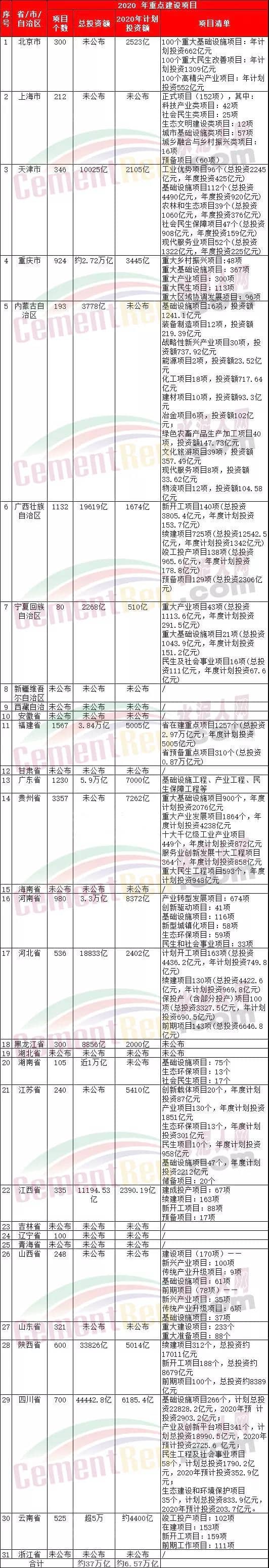 近日全國31個省、市、自治區發布了2020年計劃完成投資額規模達66958億元,其中,新基建預計投資額達15631億元,約占2020年投資額的23%。相關分析人士預計新基建7大領域合計投資規模在2020年能夠達到2萬億-2.45萬億。其中納入基建部分,拉動基建增速1.1%-2.6%。而根據各省市公布的未來幾年實施的新基建,高達37萬億。2020年各省市自治區重點建設項目如下:
