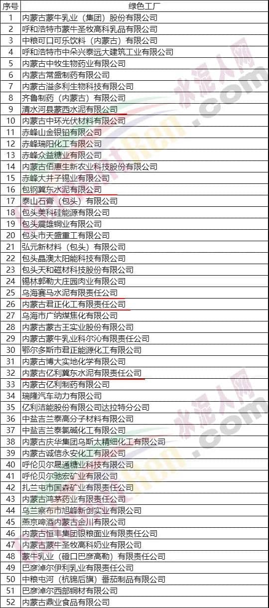 2020年內蒙古自治區綠色制造示范名單中包括清水河縣蒙西水泥有限公司、包鋼冀東水泥有限公司、烏海賽馬水泥有限責任公司、內蒙古君正化工有限責任公司、內蒙古億利冀東水泥有限責任公司等五家水泥企業。