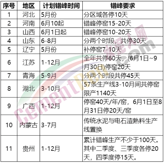 近日,山東、山西、河南省通知區域內水泥熟料生產線將于6月份開始錯峰生產。江蘇省通知熟料生產線于6月1日-9月30日停窯20天。廣西壯族自治區水泥協會通知2020年6月1日至8月31日停20天/窯。