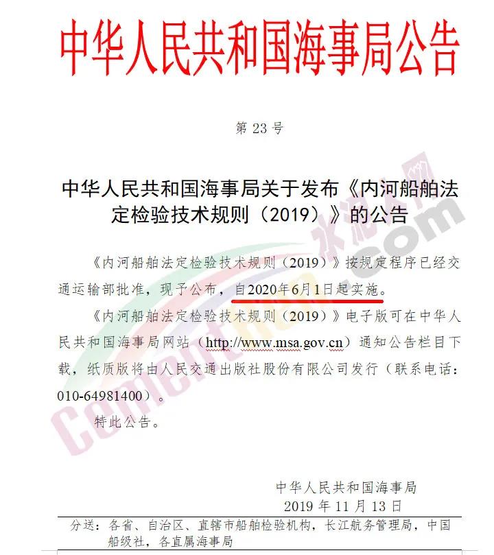 2019年11月20日,交通運輸部海事局發布了《內河船舶法定檢驗技術規則(2019)》。規則針對我國內河船長大于等于20米船舶設計建造、營運檢驗的技術法規進行了系統明確,同時對內河船舶檢驗制度、安全與防污染技術要求等方面進行了全面、系統修訂。有關負責人表示,規則的發布實施將對我國內河船舶航行安全以及環境保護起到積極促進作用。該規則將于2020年6月1日起正式實施。