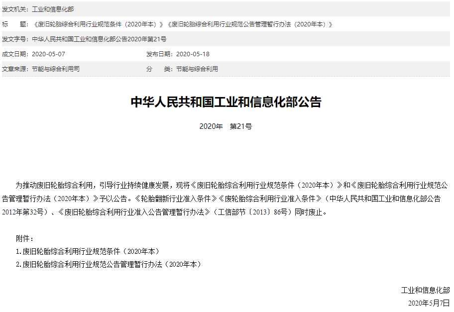 為推動廢舊輪胎綜合利用,引導行業持續健康發展,工業和信息化部日前公告《廢舊輪胎綜合利用行業規范條件(2020年本)》和《廢舊輪胎綜合利用行業規范公告管理暫行辦法(2020年本)。
