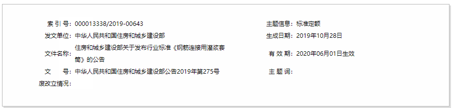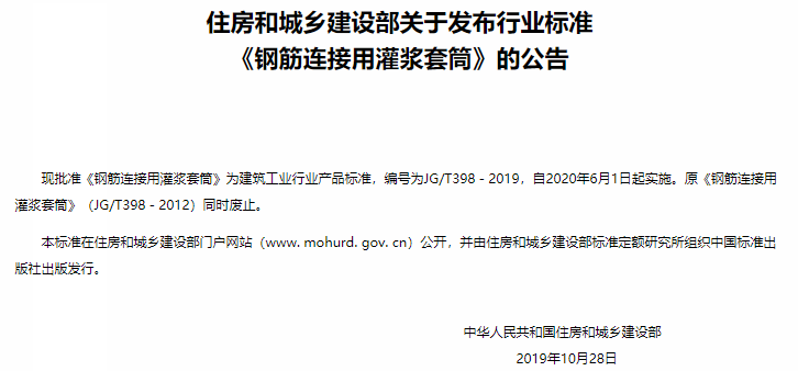 還有一件大事要關注:那就是住房和城鄉建設部發布了關于《鋼筋連接用灌漿套筒》的公告,批準由中國建筑科學研究院主編的《鋼筋連接用套筒灌漿料》為建筑工業行業產品標準,編號為JG/T408-2019,自2020年6月1日起實施。