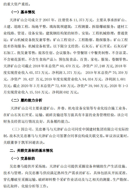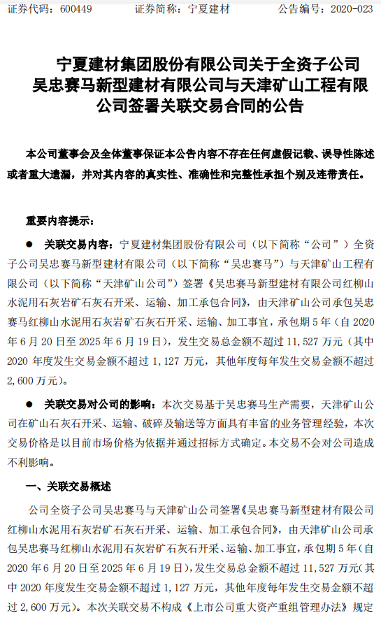 昨日(6月1日)寧夏建材(600449.SH)公布,公司全資子公司吳忠賽馬與天津礦山工程有限公司(以下簡稱“天津礦山公司”)簽署《吳忠賽馬新型建材有限公司紅柳山水泥用石灰巖礦石灰石開采、運輸、加工承包合同》,由天津礦山公司承包吳忠賽馬紅柳山水泥用石灰巖礦石灰石開采、運輸、加工事宜,承包期5年(自2020年6月20日至2025年6月19日),發生交易總金額不超過1.15億元(其中2020年度發生交易金額不超過1127萬元,其他年度每年發生交易金額不超過2600萬元)。