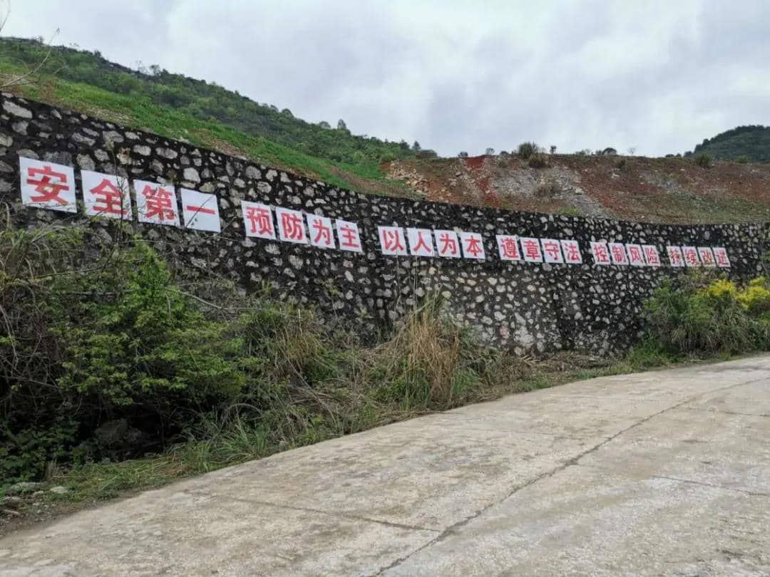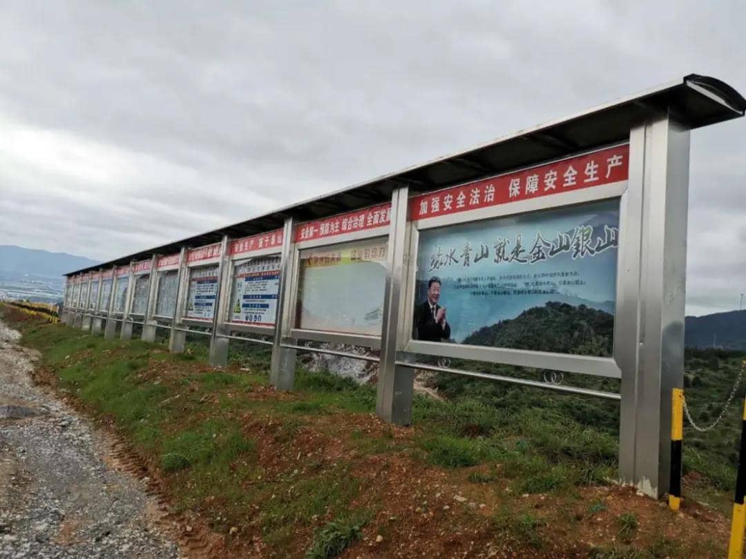 (1)作業現場。一方面實行清潔生產,購買灑水車進行道路灑水降塵,定期檢查維護收塵設備,清除設備積塵、油污,設備備品備件歸類整齊擺放到指定位置,收集廢油、白色垃圾等下山處理,確保作業現場清潔。另一方面加強形象宣傳,在礦山視野開闊位置設置參觀平臺并地面硬化,設置宣傳欄和宣傳海報,完善齊全礦山現場安全警示標示牌。
