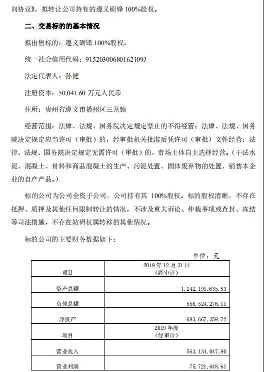 提請廣大投資者注意投資風險。交易標的的基本情況擬出售標的:遵義礪鋒 100%股權。統一社會信用代碼:91520300680162109J 法定代表人:孫健注冊資本:50,041.60 萬元人民幣住所:貴州省遵義市播州區三岔鎮經營范圍:法律、法規、國務院決定規定禁止的不得經營;法律、法規、國務院決定規定應當許可(審批)的,經審批機關批準后憑許可(審批)文件經營;法律、法規、國務院決定規定無需許可(審批)的,市場主體自主選擇經營。(干法水泥、混凝土、骨料和商品混凝土的生產、污泥處置、固體廢棄物的處置、銷售本企業的自產產品。)標的公司為公司全資子公司,公司持有其 100%股權。標的股權清晰,不存在抵押、質押及其他任何限制轉讓的情況,不涉及重大訴訟、仲裁事項或查封、凍結等司法措施,不存在妨礙權屬轉移的其他情況。公告全文如下: