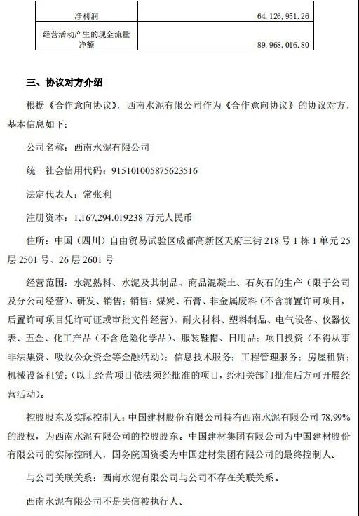西南水泥有意向由其或其控股的子公司受讓標的股權。本次意向協議的簽訂,不構成關聯交易,根據目前對標的公司規模的初步判斷,暫不構成《上市公司重大資產重組管理辦法》規定的重大資產重組。目前本次交易尚處于初步籌劃階段,交易方案需進一步論證和溝通協商,本次交易中相關方是否能夠簽署最終的股權轉讓協議具有不確定性。本次交易尚需按照相關法律、法規及公司章程的規定履行必要的審批程序。