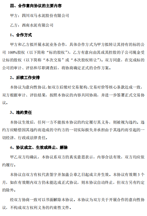 公告特別提示稱:四川雙馬水泥股份有限公司已于 2020 年 5月 29 日與西南水泥有限公司簽署了《合作意向協議》。公司擬轉讓所持有的遵義礪鋒水泥有限公司100%股權 。