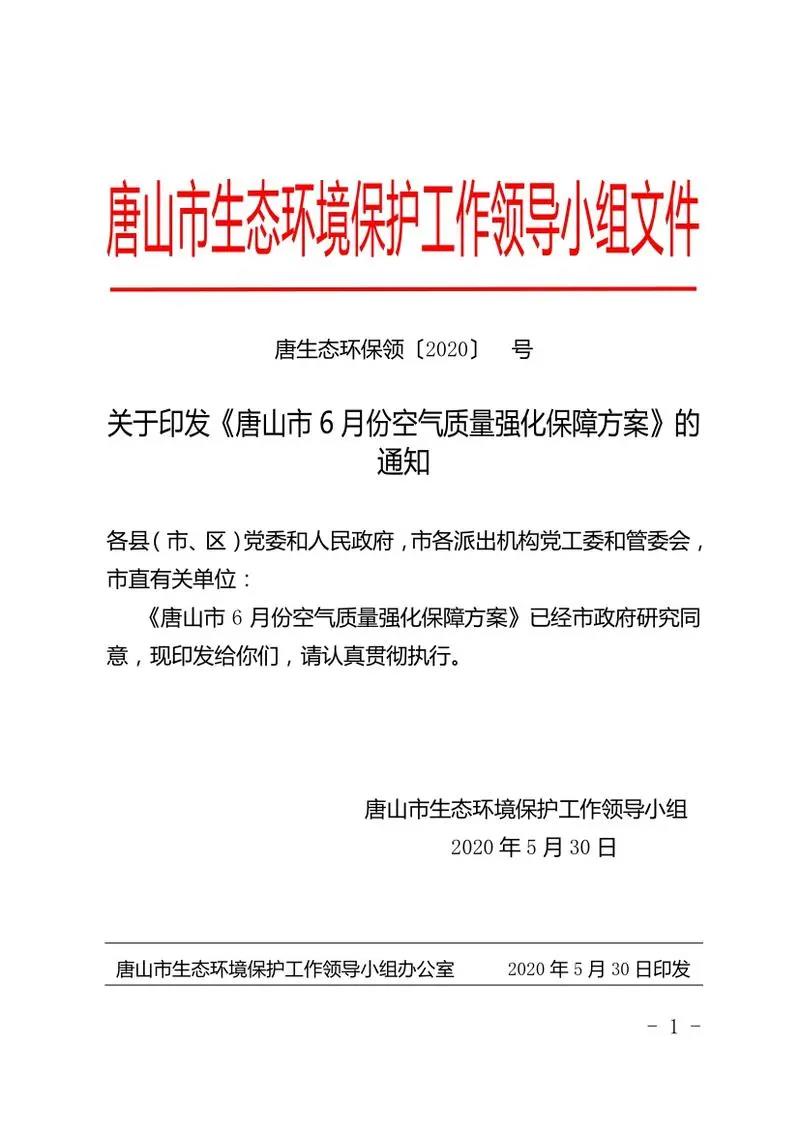 同期,唐山市玉田縣生態環境保護工作領導小組了發布了6月份空氣質量強化保障方案。