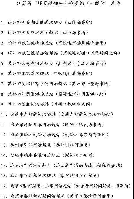 江蘇省將在省際相鄰水域、京杭運河沿線和通江口門等處建立18個“江蘇省環蘇船舶安全檢查站(一級)”作為“治超站”(名單附后),對過往船舶實施現場檢查。對外省擬進入我省內河水域的超載超限船舶,各檢查站點要采取勸返、驅離的方式,禁止此類船舶進入我省內河水域。