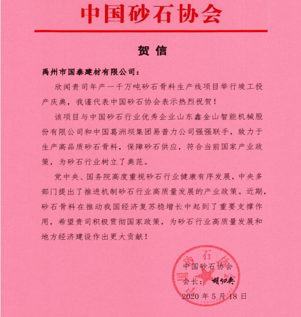 胡會長強調(diào),黨中央國務(wù)院高度重視砂石行業(yè)健康有序發(fā)展,中央多部門提出了推進機制砂石行業(yè)高質(zhì)量發(fā)展的產(chǎn)業(yè)政策。近期,砂石骨料在推動我國經(jīng)濟復蘇穩(wěn)增長中起到了重要的支撐作用,希望禹州市國泰建材有限公司積極貫徹國家政策,為砂石行業(yè)高質(zhì)量發(fā)展和地方經(jīng)濟建設(shè)做出更大貢獻。