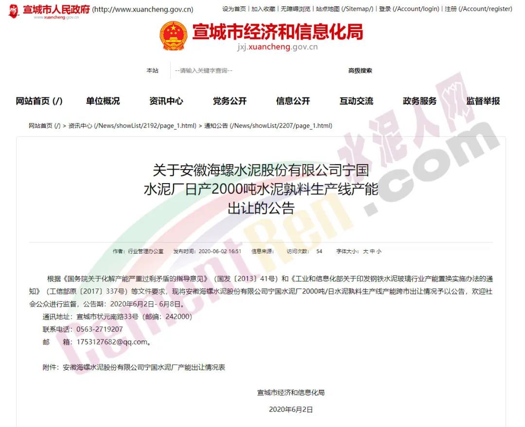 6月2日宣城市人民政策發布《關于安徽海螺水泥股份有限公司寧國水泥廠日產2000噸水泥孰料生產線產能出讓的公告》稱,根據《國務院關于化解產能嚴重過剩矛盾的指導意見》(國發〔2013〕41號)和《工業和信息化部關于印發鋼鐵水泥玻璃行業產能置換實施辦法的通知》(工信部原〔2017〕337號)等文件要求,現將安徽海螺水泥股份有限公司寧國水泥廠2000噸/日水泥孰料生產線產能跨市出讓情況予以公告,歡迎社會公眾進行監督,公告期:2020年6月2日- 6月8日。