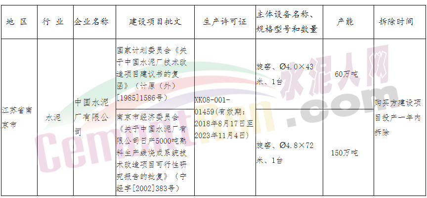 產能出讓情況表顯示,位于安徽省寧國市港口鎮山門村的安徽海螺水泥股份有限公司寧國水泥廠將出讓2000t/d熟料生產線(于2023年6月底前淘汰拆除)給位于安徽省池州市牛頭山鎮的池州海螺水泥新建日產10000噸水泥熟料生產線,受讓產能為2000t/d。同期有消息稱,前期江蘇省公示的中國水泥廠退出產能也將用于新建池州海螺水泥萬噸線項目。6月1日,江蘇省工信廳發布《關于中國水泥廠有限公司產能確認的公告》將中國水泥廠共210萬噸/年產能置換出讓。
