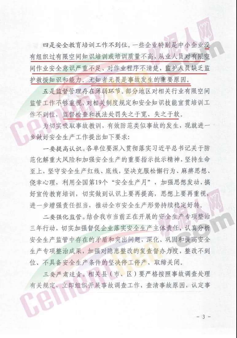 省安委辦關(guān)于迅速開展有限空間作業(yè)安全生產(chǎn)專項(xiàng)治理工作的通知稱,事故發(fā)生后,省領(lǐng)導(dǎo)批示指出,針對(duì)有限空間安全防范多次要求但事故屢禁不止,要嚴(yán)格按“四不放過(guò)”原則徹底調(diào)查,并專門就此類事故防范展開督查,督促各有關(guān)企業(yè)制定專項(xiàng)安全方案,切實(shí)把事故率、死亡率降低下來(lái)。