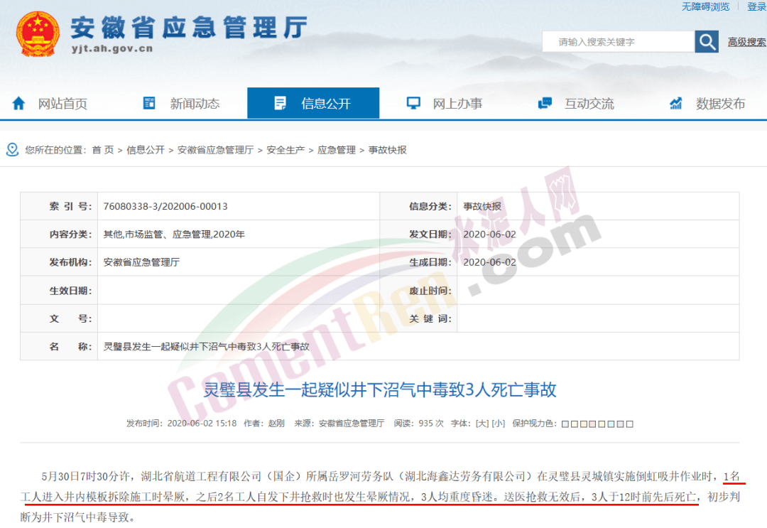 據(jù)安徽省應(yīng)急管理廳網(wǎng)站消息,5月30日,靈璧縣發(fā)生一起疑似井下沼氣中毒致3人死亡事故。5月30日7時(shí)30分許,湖北省航道工程有限公司(國(guó)企)所屬岳羅河勞務(wù)隊(duì)(湖北海鑫達(dá)勞務(wù)有限公司)在靈璧縣靈城鎮(zhèn)實(shí)施倒虹吸井作業(yè)時(shí),1名工人進(jìn)入井內(nèi)模板拆除施工時(shí)暈厥,之后2名工人自發(fā)下井搶救時(shí)也發(fā)生暈厥情況,3人均重度昏迷。送醫(yī)搶救無(wú)效后,3人于12時(shí)前先后死亡,初步判斷為井下沼氣中毒導(dǎo)致。