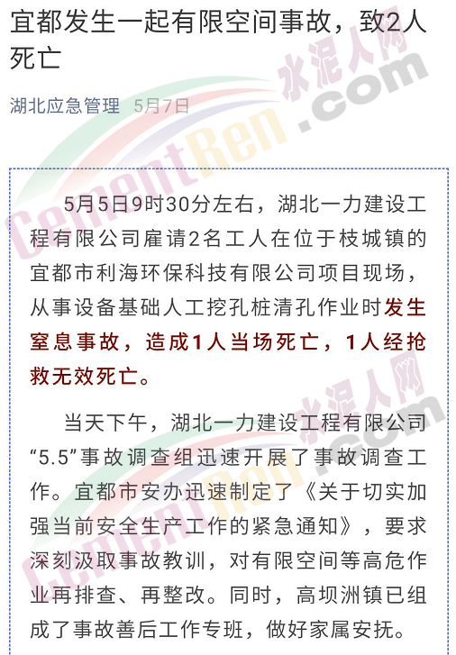 湖北省應(yīng)急管理廳官方微信發(fā)布消息:2020年5月5日9時(shí)30分左右,湖北一力建設(shè)工程有限公司雇請(qǐng)2名工人在位于枝城鎮(zhèn)的宜都市利海環(huán)??萍加邢薰卷?xiàng)目現(xiàn)場(chǎng),從事設(shè)備基礎(chǔ)人工挖孔樁清孔作業(yè)時(shí)發(fā)生窒息事故,造成1人當(dāng)場(chǎng)死亡,1人經(jīng)搶救無(wú)效死亡。