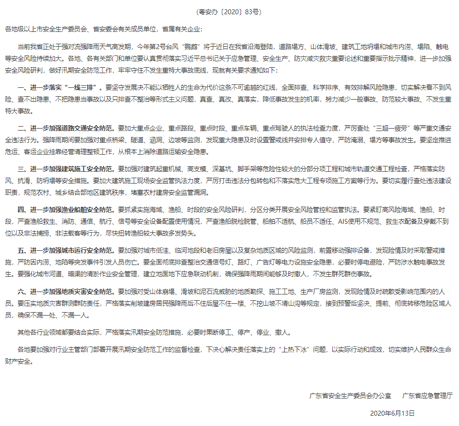 6月13日,廣東省安委辦、省應(yīng)急管理廳就進(jìn)一步加強(qiáng)汛期安全防范工作發(fā)出通知,要求各地、各有關(guān)部門和單位要進(jìn)一步加強(qiáng)安全風(fēng)險(xiǎn)研判,做好汛期安全防范工作,各地要加強(qiáng)對(duì)行業(yè)主管部門部署開展汛期安全防范工作的監(jiān)督檢查,牢牢守住不發(fā)生重特大事故底線。