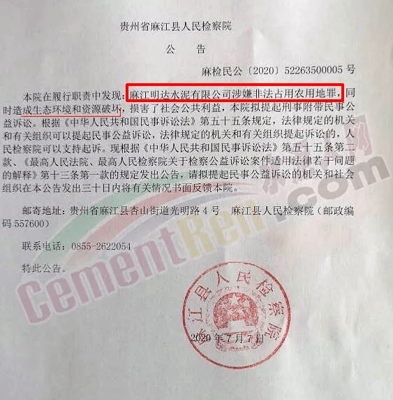 日前貴州省麻江縣人民檢察院發布公告稱,在履職中發現麻江明達水泥有限公司涉嫌非法占用農用地罪,同時造成生態環境和資源破壞,損害了社會公共利益,本院擬提起刑事附帶民事公益訴訟。