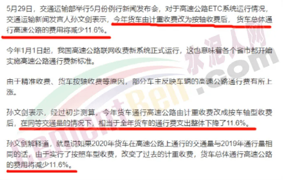 交通運輸部新聞發言人孫文劍表示,經過初步測算,今年貨車通行高速公路由計重收費改成按車軸型收費后,在同等交通量的情況下,相當于全年貨車的通行費支出整體下降了11.6%。