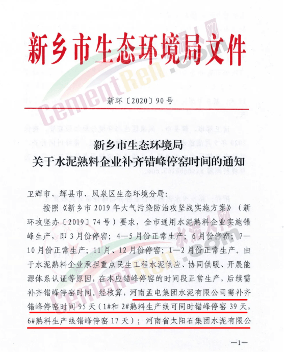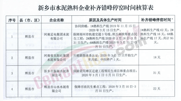 日前,河南省新鄉市生態環境局發布《關于水泥熟料企業補齊錯峰停窯時間的通知》稱:按照《新鄉市2019年大氣污染防治攻堅戰實施方案》(新環攻堅辦〔2019〕74號)要求,全市通用水泥熟料企業實施錯峰生產,即3月份停窯;4-5月份正常生產;6月份停窯;7-10月份正常生產;11月、12月份停窯;1—2月份正常生產。