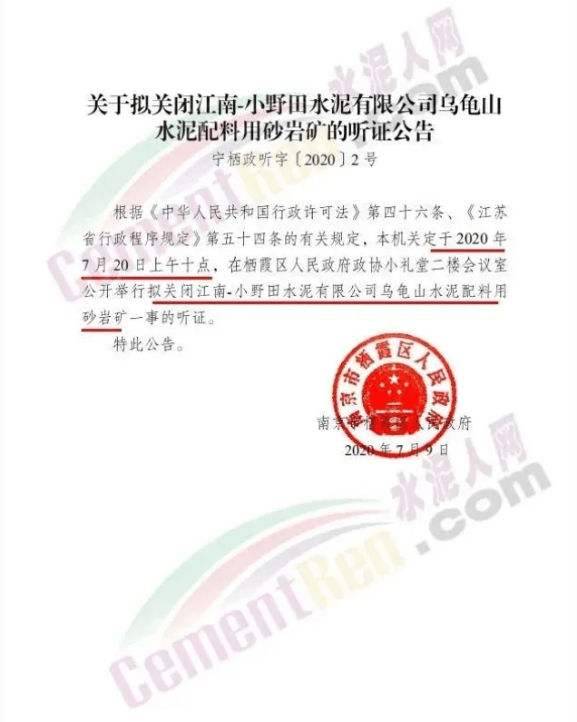 在蘇北淮海中聯水泥退出一事懸而未決之時,南京市棲霞區政府的這兩則聽證會公告,更加重了當地水泥行業的緊張情緒。據水泥人網了解,2019年7月8日和10月15日淮海中聯水泥所屬焦山礦區和青龍山礦區開采許可證分別到期,骨料、熟料及粉磨生產線相繼停產。當地政府未再續批礦山許可。淮海中聯水泥一直外購礦石用于生產。