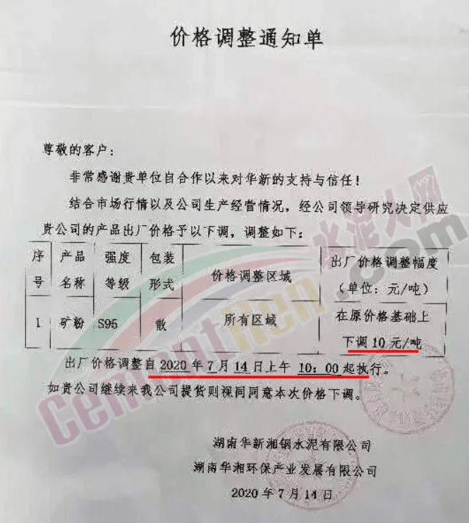華東某礦粉經銷商表示,隨著水泥和熟料價格的下調,礦粉價格也隨之降低10-20元/噸。同期,華中大廠華新湘鋼水泥通知結合市場行情及公司營銷情況,經公司研究決定自7月14日起下調S95礦粉價格10元/噸。